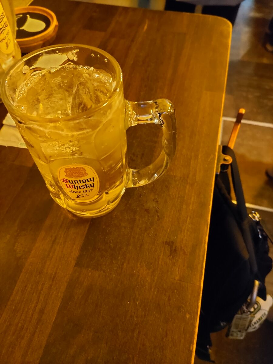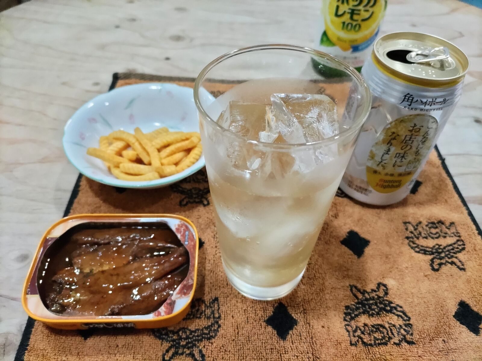 下は角ハイの炭酸割りとイワシの缶詰めなど。