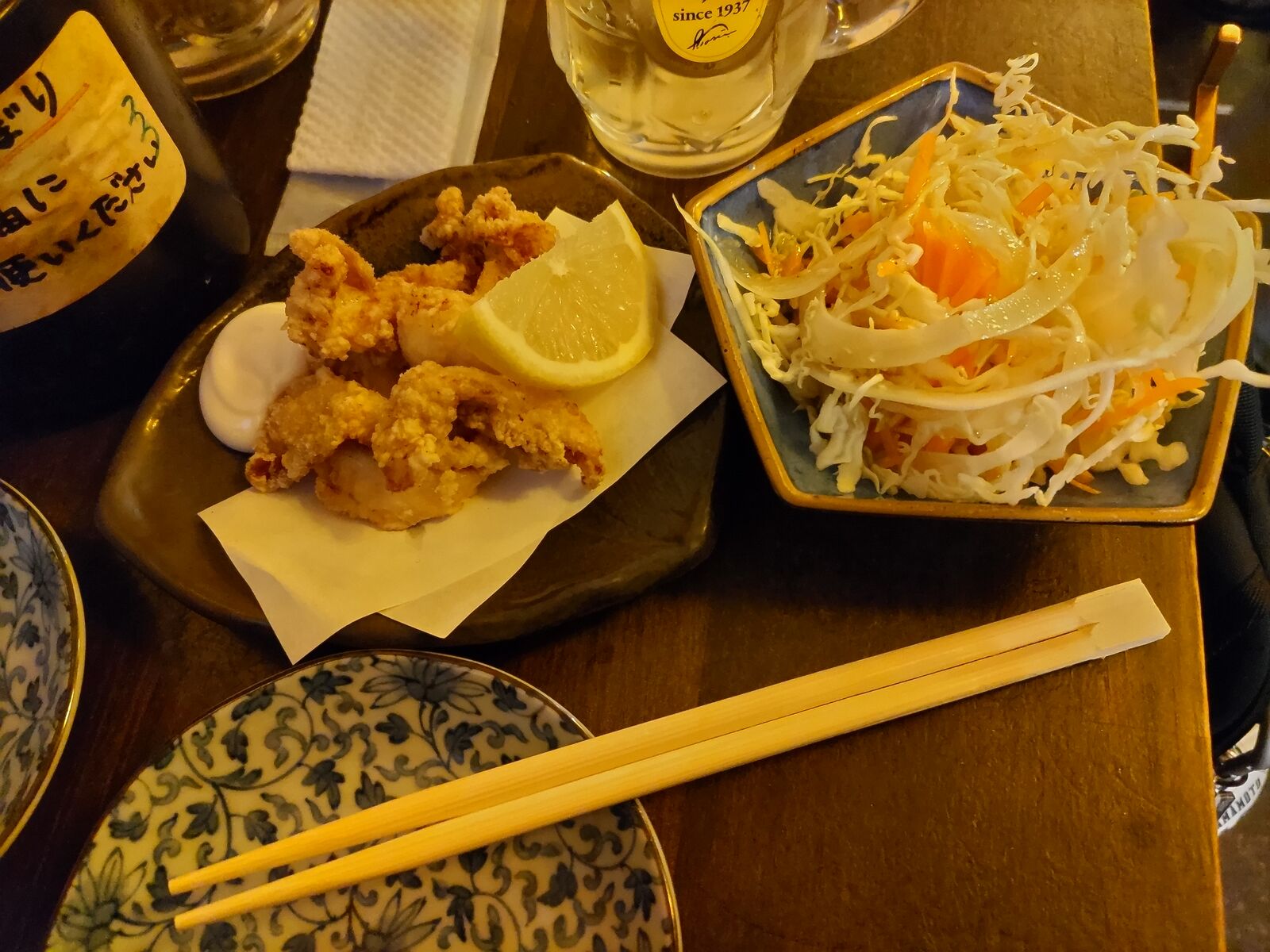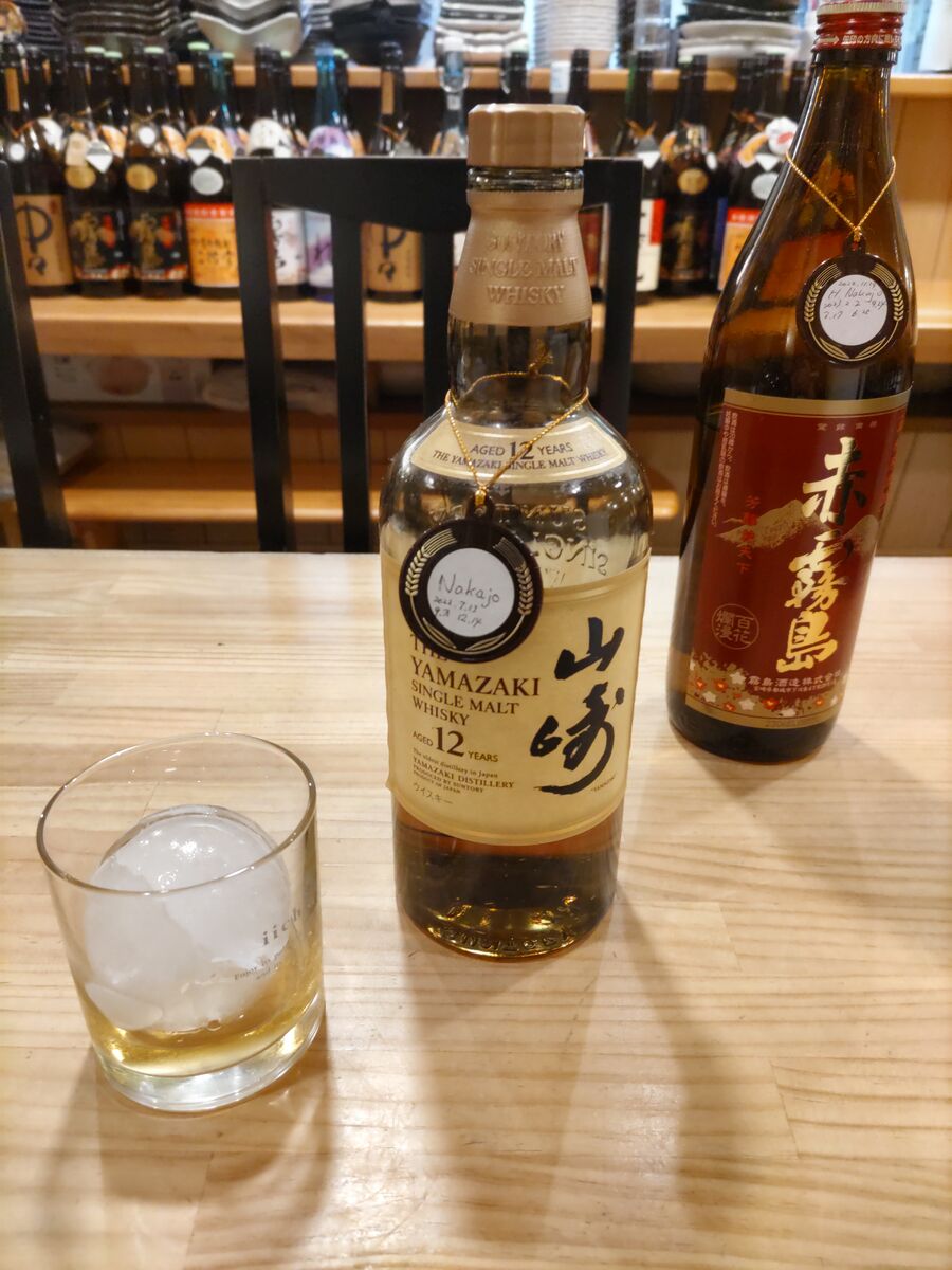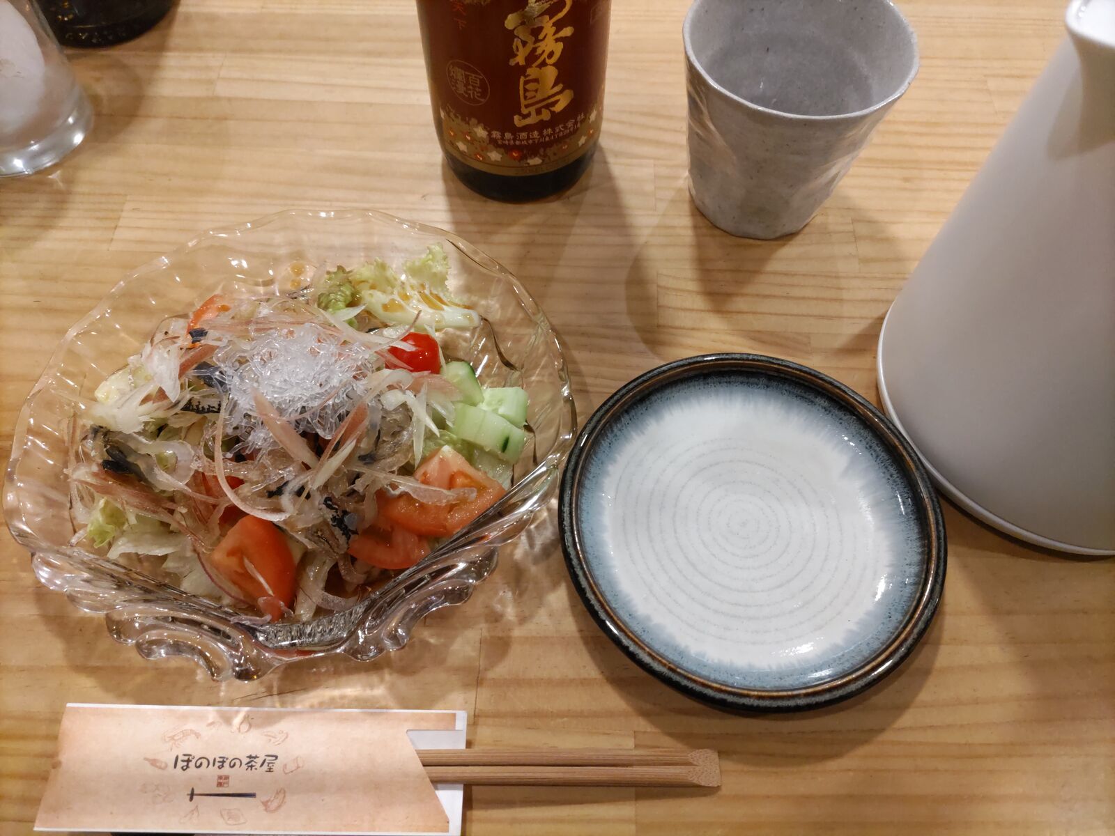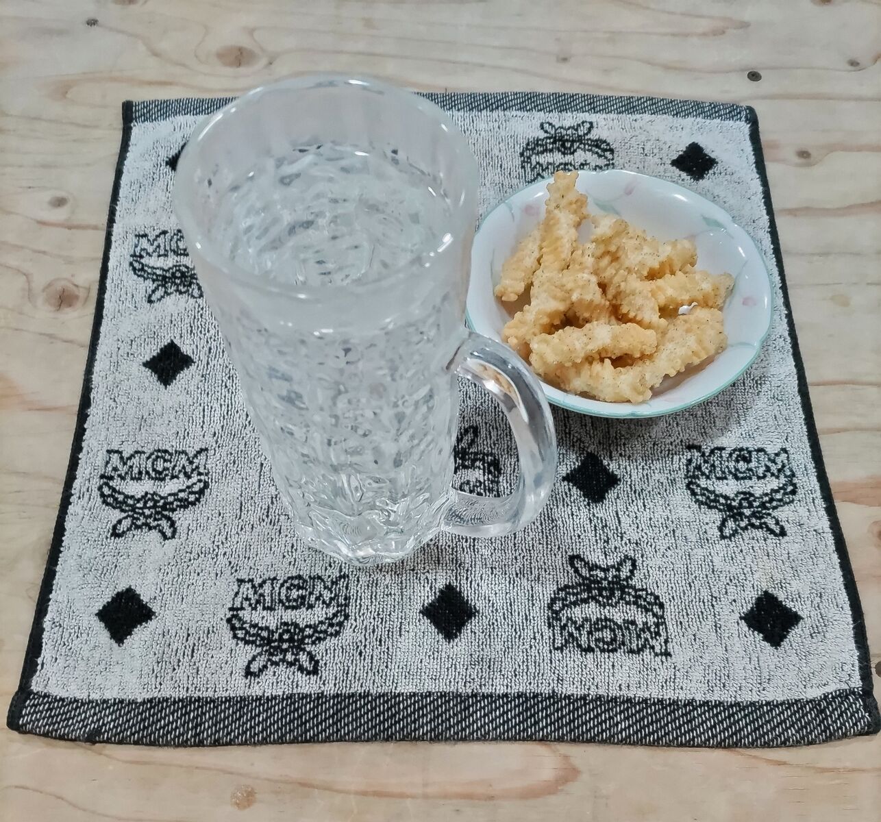 上がクロキリのお湯割りと付き出しオカキで、