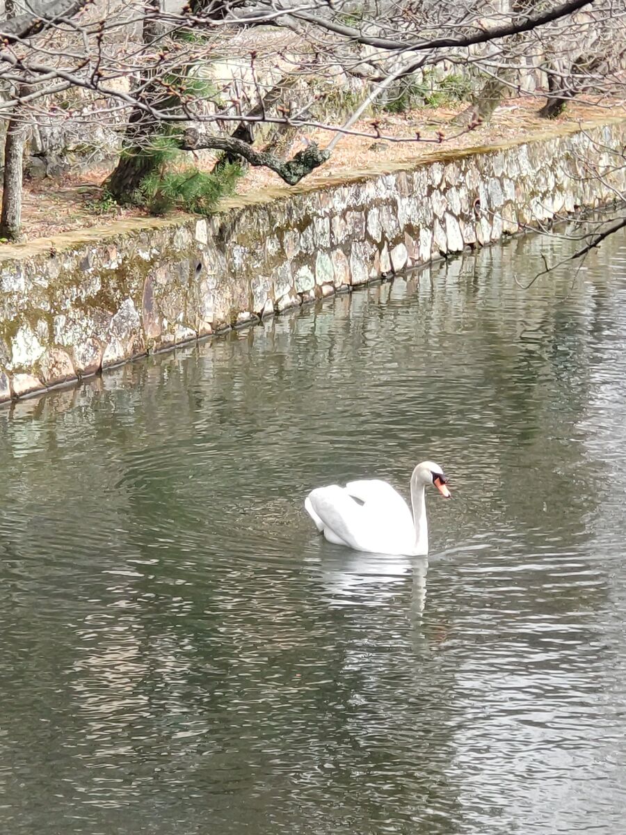 川面に浮かぶ白鳥と川べりの椿とを合わせ観る眼福。