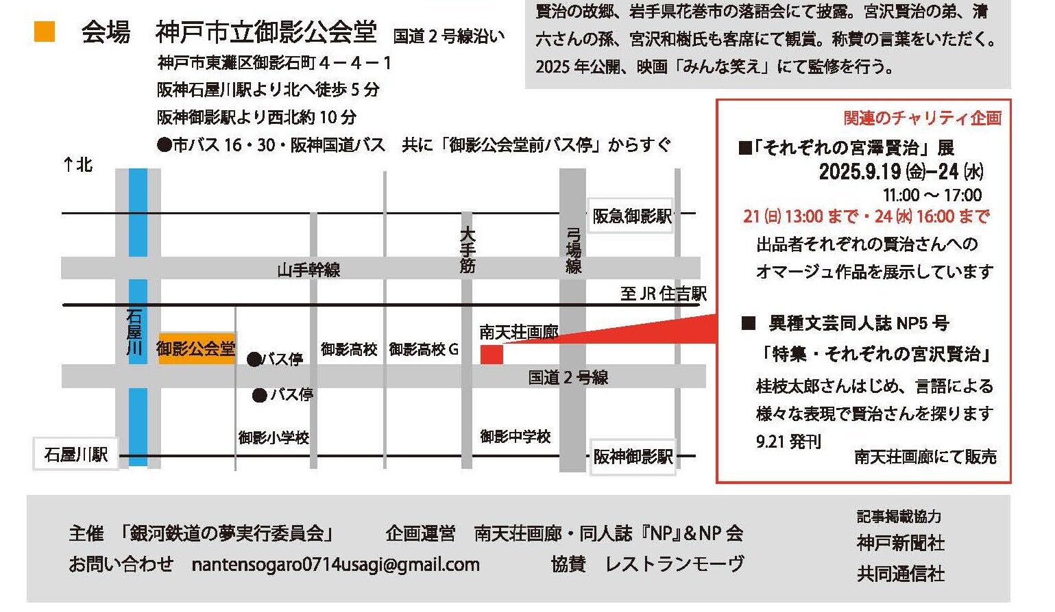 を歴史的建造物の御影公会堂で開催(主催は銀河鉄道の夢実行委員会、NPはイベントプロデューサー)することになりましたので、併せてご連絡報告をさせて戴きます。